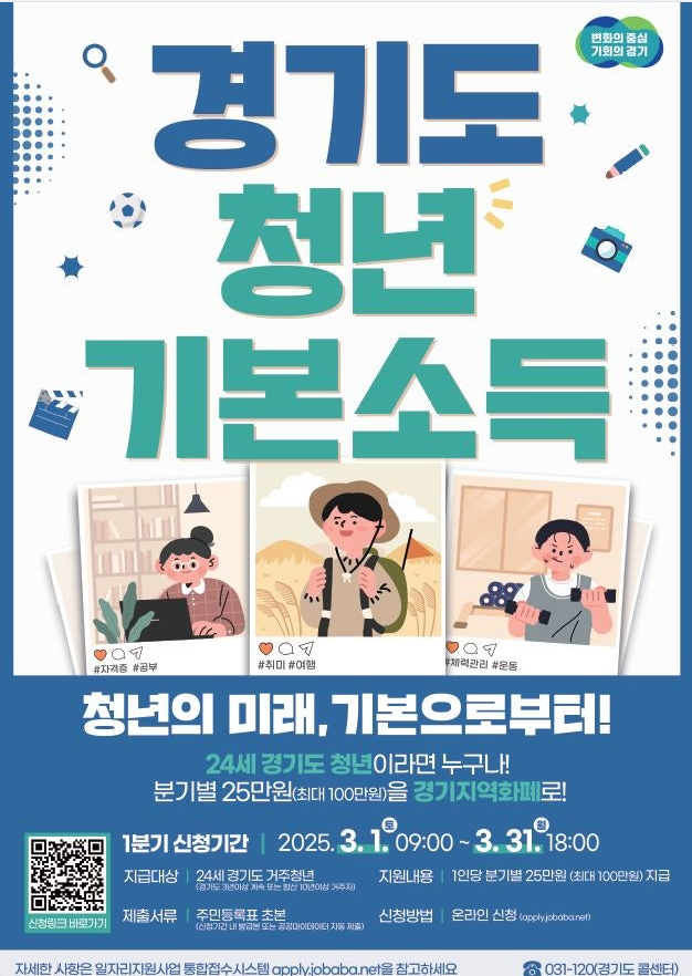 힘내자 경기청년! 청년의 미래, 기본으로부터! 경기도 청년기본소득 1분기 신청기간: 2025.3.1.(토) 09:00 ~ 2025.3.31.(월) 18:00 #경기청년 #24세 #분기별25만원지급